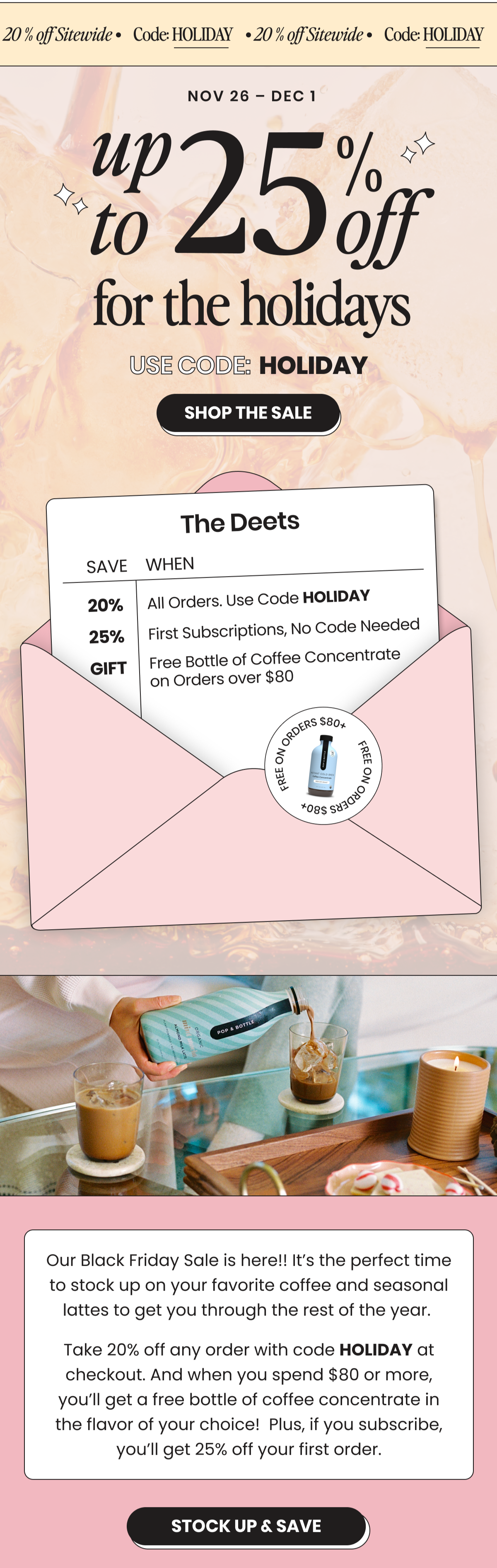 The Pop & Bottle email strategy is based both on conversion and community building. I collaborate with the technical strategist to build out campaigns and flows grounded in data. I also plan out and write the monthly promotions, recipes, launches, and seasonal emails.